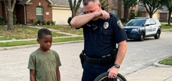 Een politieagent pakte de fiets van een zevenjarig jongetje af en sloeg hem voor zijn ogen kapot. Het jongetje huilde en smeekte hem om het niet te doen,
