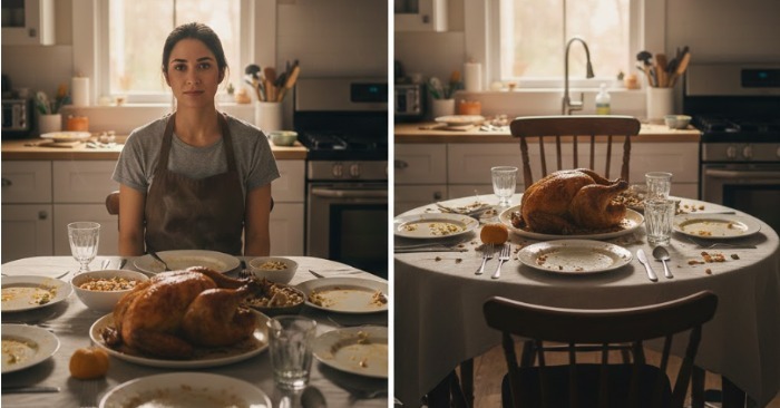 Ik ging op een stoel zitten en mijn handen begonnen te trillen. Ik keek naar de tafel — naar de gerechten waarin ik mijn hart had gelegd, naar de decoraties die ik urenlang had geschikt — en ik voelde alsof iemand alle energie uit me had weggerukt. Toen kwam mijn man binnen.
