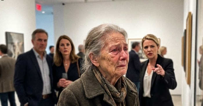 Ik liet de oude vrouw binnen, die door iedereen werd genegeerd — ze stopte voor één schilderij en fluisterde: “Dit is mijn leven.” Tot op de dag van vandaag herinner ik me hoe ze daar bij de galerijdeur stond, koud, verwaarloosd, met ogen die meer gezien hadden dan wij ooit zouden willen zien. Mensen liepen langs haar heen alsof ze lucht was.