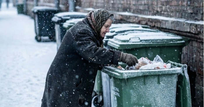 Ik zag haar toevallig. Eerst alleen een beweging aan de zijkant. Een oude vrouw stond bij de groene container, probeerde deze open te krijgen. Haar bewegingen waren traag, voorzichtig. Ze leek te zwak om tegen de kou te vechten, maar stond toch.