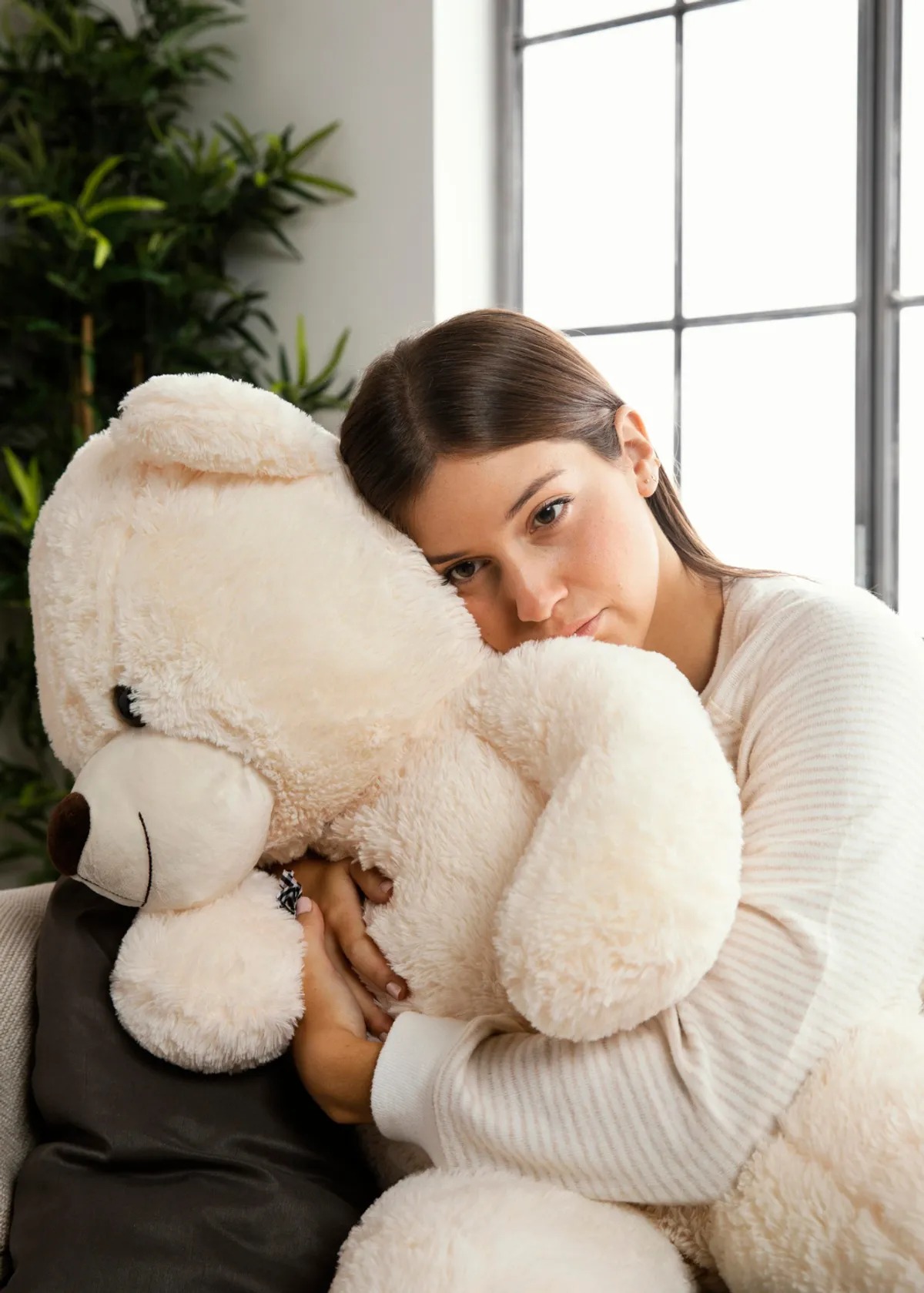 Maar dit was niet het zelfverzekerde, brutale meisje van onze bruiloft. Deze vrouw was een schim van zichzelf. Uitgemagerd, met kort haar, een teddybeer tegen haar borst geklemd. Ze keek Dan vol bewondering aan, maar haar ogen waren leeg, als die van een klein kind.