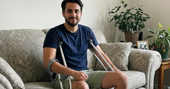 Toen ik naar de gang ging, stond hij daar op krukken.