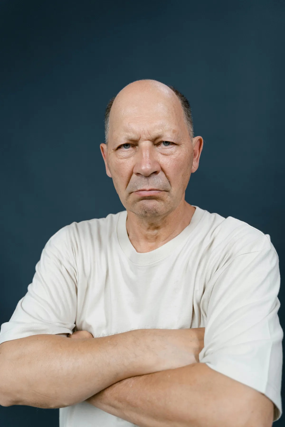 Een man met gekruiste armen, zijn gezicht vol woede en teleurstelling.