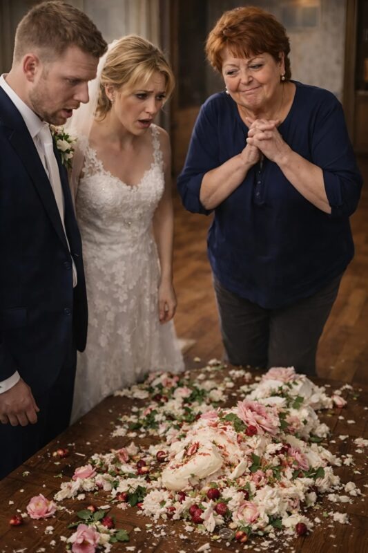 “Oh, sorry,” zei ze, terwijl ze haar handen omhoog hield. “Ik struikelde per ongeluk. De taart gleed gewoon uit mijn handen.”