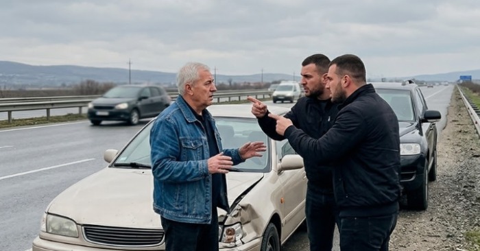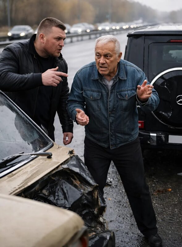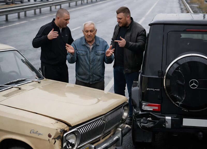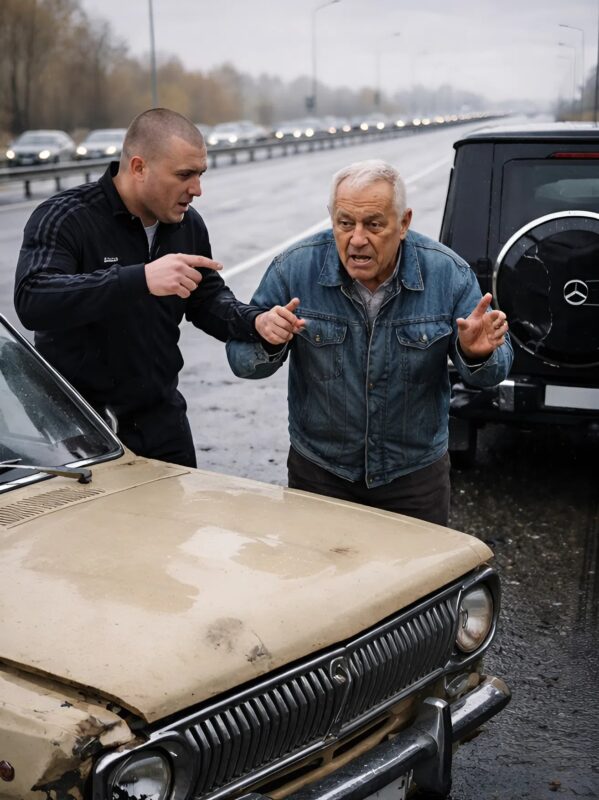 Hij zag een zwarte SUV in zijn achteruitkijkspiegel. Die kwam veel te snel dichterbij. Groot, glanzend en agressief. Eerst naderde hij de vrachtwagen, toen begon hij plotseling naar rechts te zwenken – recht voor de Volga. Zonder richtingaanwijzer. Zonder richtingaanwijzer. Hij duwde de bejaarde bestuurder gewoon richting de vangrail.
