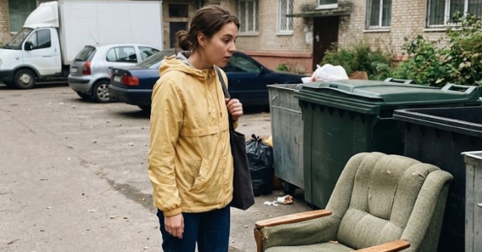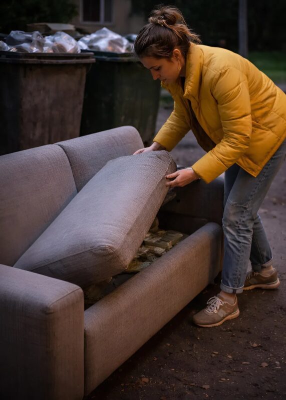 Emma ging die avond naar buiten om het vuilnis buiten te zetten. De tuin was gewoon, stil en grijs. Een oude fauteuil en een paar vuilniszakken stonden naast de afvalcontainers. Op dat moment stopte er een kleine vrachtwagen bij de container. Twee mannen stapten uit, laadden snel de versleten fauteuil uit en reden zonder om te kijken meteen weer weg.